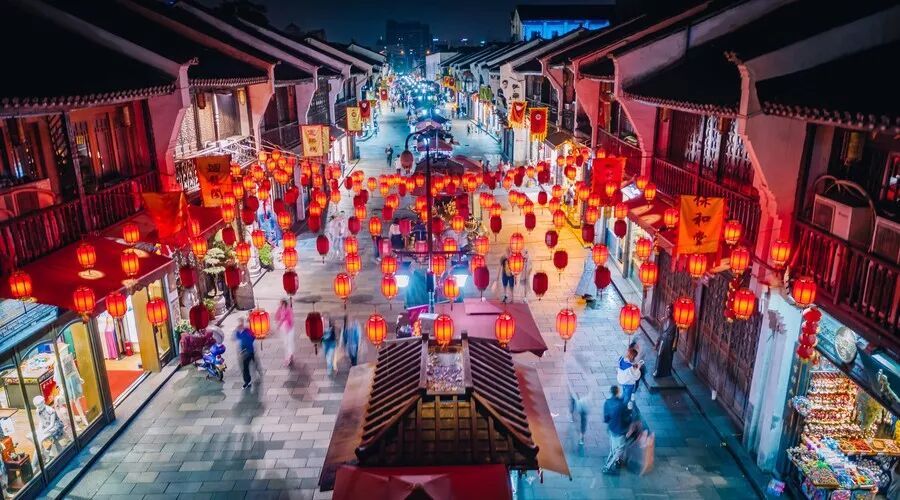 人頭攢動(dòng)的集市上,擺滿了紅艷的燈籠