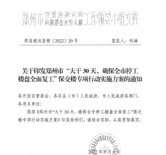 這份引起廣泛關(guān)注的文件名為《關(guān)于印發(fā)鄭州市“大干30天,確保全市停工樓盤全面復(fù)工”保交樓專項(xiàng)行動(dòng)實(shí)施方案的通知》(以下簡稱《通知》),落款為“鄭州市安置房建設(shè)和問題樓盤攻堅(jiān)化解工作領(lǐng)導(dǎo)小組”?!锻ㄖ芬?,在10月6日前,實(shí)現(xiàn)鄭州全市所有停工問題樓盤項(xiàng)目全面持續(xù)實(shí)質(zhì)性復(fù)工。